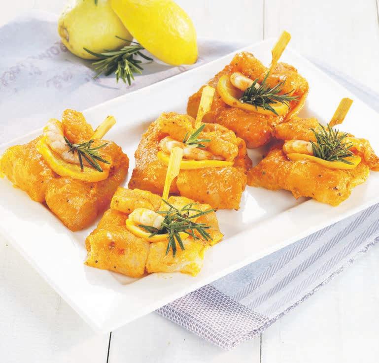 Garnele-Orange feines Pangasiusfilet, praktisch grätenfrei, ohne Haut, in pikanter Marinade mit Garnele und Orange auf einem Spieß 1kg = 19,90 100g