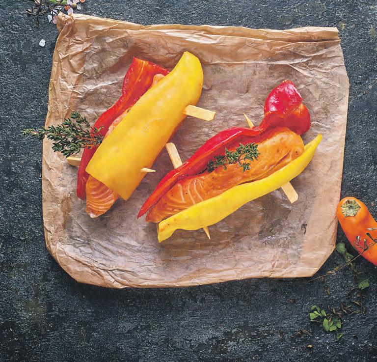 Lachsfilet Spitzpaprika frische Lachsfiletportionen, praktisch grätenfrei und ohne Haut, mit pikanter Tomaten-Marinade in gelber und roter Spitzpaprika gespießt 1kg = 29,90