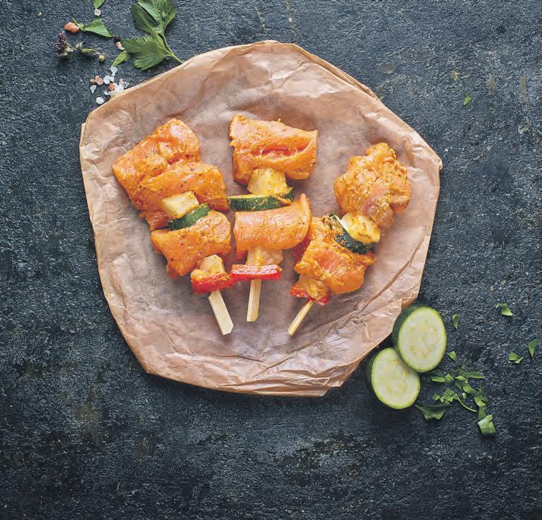 Hawaii saftige Lachsfiletstücke, praktisch grätenfrei und ohne Haut, mit Ananas, Zucchini und roter Paprika auf einem Spieß und mit rotem Curry mariniert 1kg = 26,90 100g