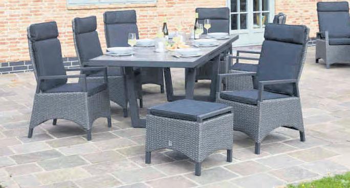 KERAMO MIT AUSZIEHTISCH bestehend aus 6 Verstell-Geflechtsesseln Keramo mit Gasdruckfedersystem inkl. Sitz- und Rückenkissen und 1 Alu-Ausziehtisch Keramo mit Keramikplatte 200/260 x 100 cm