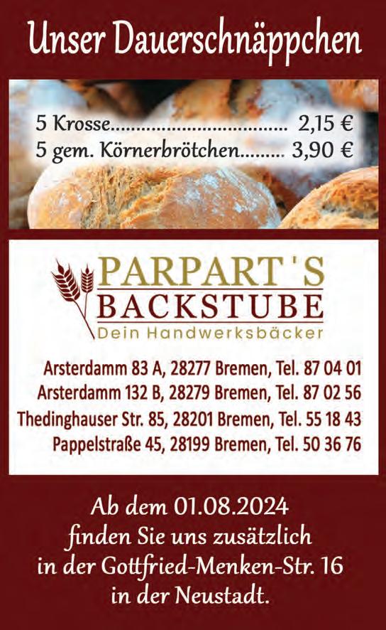 Zurzeit gelten Anzeigenpreisliste Nr. 51 vom 1. Januar 2024 und unsere darin abgedruckten AGB. Falls Sie dieses Produkt nicht mehr erhalten möchten, bitten wir Sie, einen Werbeverbotsaufkleber mit dem Zusatzhinweis „Keine kostewnlosen Zeitungen“ an Ihrem Briefkasten anzubringen. Weitere Informationen finden Sie auf dem Verbraucherportal www.werbung-im-briefkasten.de Internet: www.weserreport.de Druck: DruckHaus Delmenhorst GmbH Verbreitete Auflage: 268.881 Exemplare mit DELME REPORT, HAMME REPORT und WÜMME REPORT 353.160 Exemplare