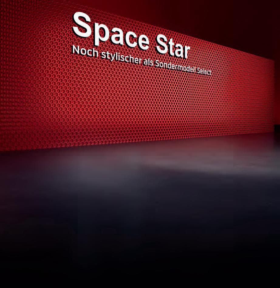 Space Star Select 1.2 52 kW (71 PS) 5-Gang Energieverbrauch 5,0 l/100 km Benzin; CO₂-Emission 113 g/km; CO₂Klasse C; kombinierte Werte.** 1 | Unverbindliche Preisempfehlung der MMD Automobile GmbH, ab Importlager, zzgl. Überführungskosten, Metallic-, Perleffekt- und Premium-Metallic-Lackierung gegen Aufpreis. 2| Unverbindlich empfohlener Aktions-Preis der MMD Automobile GmbH, ab Importlager und solange der Sondermodell-Vorrat reicht, zzgl. Überführungskosten, Metallic-Lackierung gegen Aufpreis. Der unverbindl. empfohl. Aktions-Preis ergibt sich aus der unverbindl. Preisempfehlung abzgl. des unverbindl. empfohl. Aktions-Rabattes. Die genauen Endpreise erfahren Sie bei Ihrem Mitsubishi Handelspartner.
