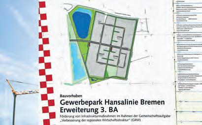 Das erste Bauschild am Rande der Europaallee lässt große Veränderungen erahnen: Die Arbeiten zur Erweiterung des Gewerbegebietes Hansalinie um rund 135 Hektar starten. Bereits in diesem Frühjahr erfolgt die Umlegung der Wegverbindungen am südlichen Rande des Gewerbegebietes, bevor dann Ende Mai die gemeinsame Ausschreibung für die Wegeumlegung, die Verlegung des Arberger Kanals und die Gewässerherstellung des Sandentnahmesees veröffentlicht wird, erläutert Andrea Bischoff aus der Pressestelle der Wirtschaftsförderung Bremen (WFB). Entlang der zukünftigen Erschließungstrasse wurden schon vor Wochen Dreiecke aus Bauzäunen aufgestellt, damit eine Bruttätigkeit im gesamten Bereich ausgeschlossen werden kann. Denn