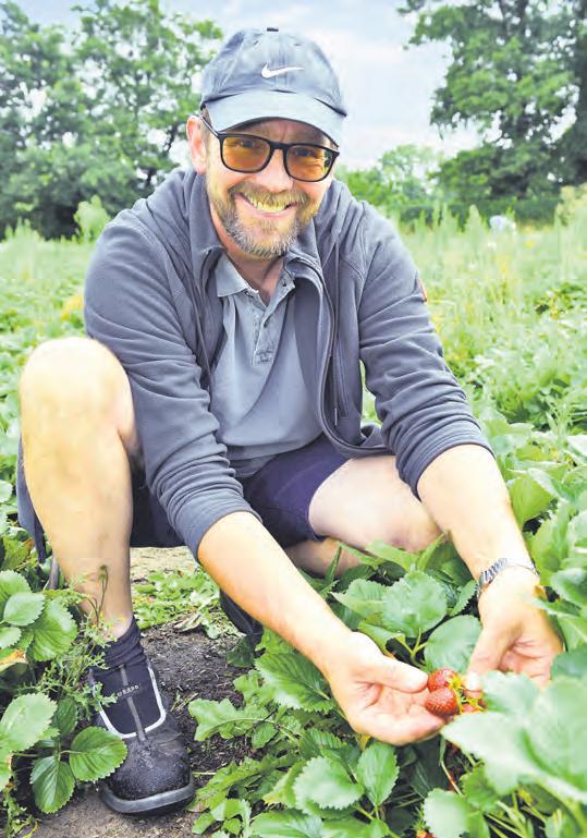 Hajo Kaemena hält eine der letzten Erdbeeren auf dem Feld in den Händen. Am letzten Pflücktag kamen einige Besucher, Melancholie aber auch Vorfreude auf die Zukunft zusammen. Foto: Schlie