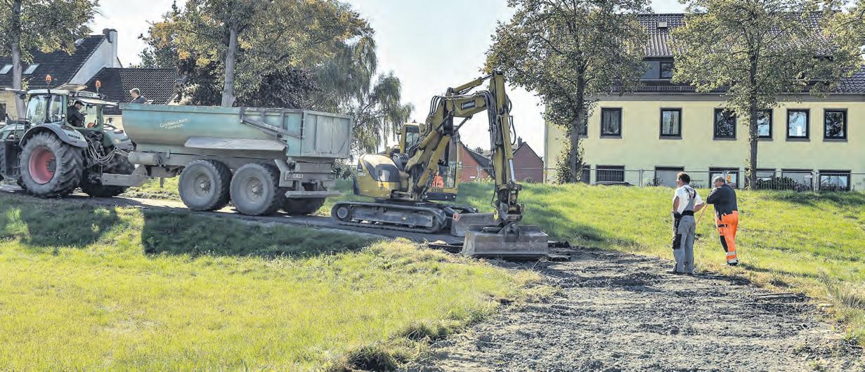 mäßig aufgebracht wird, ist offenbar nicht dazu geeignet, um auf kurzen Abschnitten mit wechselndem Gefälle zu arbeiten. Laut Anwohnerinformation des Deichverbandes sollen die Podeste deshalb zunächst ausgespart und dann in Handarbeit hergestellt werden. Der Ausführungsplanung und den DIN-Vorschriften zur Barrierefreiheit wäre dann genüge getan. „Ich komme in ein paar Wochen wieder und schaue mir an, wie das wohl aussieht“, sagt einer der Bauarbeiter, der gerade dabei ist, Löcher in den eigentlich fertigen Weg zu stemmen. Die innere Abneigung gegen das, was er da gerade macht, steht ihm ins Gesicht geschrieben. Laut Dierks wird es insgesamt keine Bauzeitverlängerung durch die Nachbesserung geben und das Projekt trotzdem noch in diesem Jahr abgeschlossen sein.