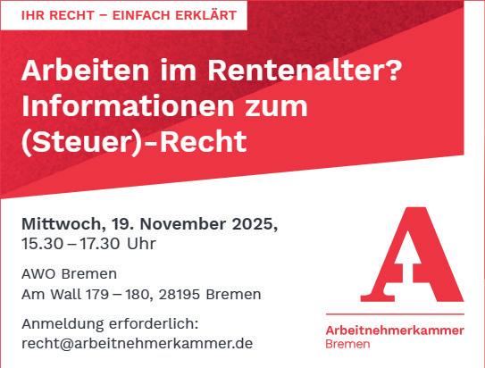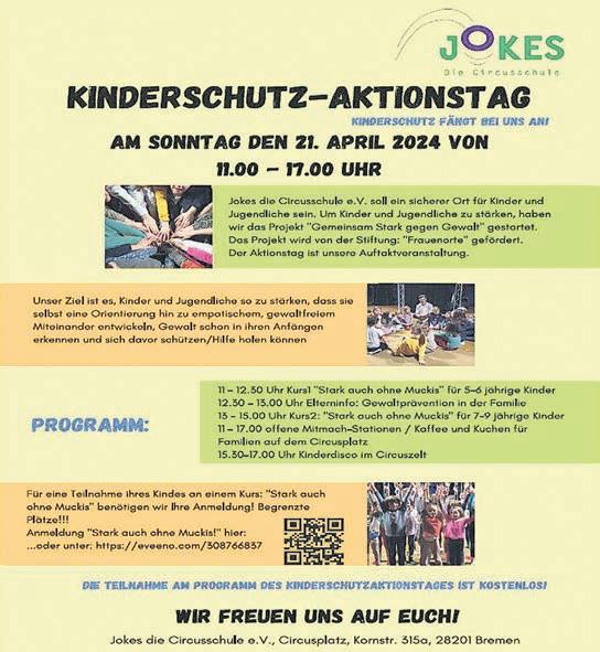 Das Rathaus steht am Mittwoch, 12. November, im Zeichen der Novemberpogrome von 1938: Die „Nacht der Jugend“ erinnert daran unter dem Motto „We all need each other“. Zeitzeugen erzählen aus erster Hand: Kurt Tallert, alias Retrogott, erinnert an seinen von den Nazis verfolgten Vater. Hermann Ernst und Marcus Reichert vom Bremer Sinti-Verein berichten von den Erfahrungen ihrer Familien. Bürgermeister Andreas Bovenschulte verweist auf heute: „Rechtsextreme Parolen und Hass bedrohen unser Miteinander.“ Auf dem Programm stehen etwa Theater, Diskussionen, Infostände und Hip-Hop. Einlass ab 17.30 Uhr. mas