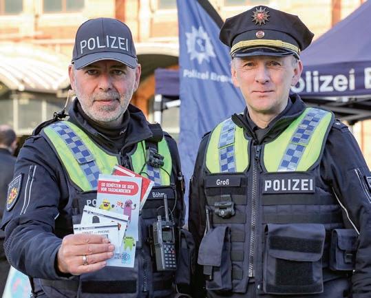 waltkriminalität und Taschendiebstahl zu informieren“, beschreibt Torsten Groß (r.) die Aktion. Der Leiter des Kommissariats Mitte hat auch Tipps: „Gegen Diebstahl Taschen schließen und Wertsachen dicht am Körper tragen.“ Bei Gewalt: „Bitte nicht nichts machen und den Notruf wählen.“ mas/Foto: M. Schmidt