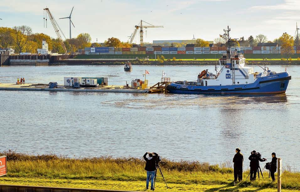 120 Meter lang, 32 Meter breit, und 22.000 Tonnen schwer: Schlepper bugsierten am Donnerstagmittag Martha nach 60 Kilometern Fahrt über die Weser zur Oslebshauser Schleuse. Dabei guckten nur die oberen 50 Zentimeter des Betonkastens aus dem Wasser. Martha ist das zweite von insgesamt sechs Bauelementen, die ab Mitte 2027 in der Weser versenkt und zu einem Tunnel zwischen Seehausen und Burg-Grambke verbunden werden sollen, um die Lücke zwischen den Enden der Autobahn 281 zu schließen. Schwesterelement Judith war bereits am Montag an ihrem Liegeplatz im Kalihafen angekommen. Judith soll später auch als erstes auf Seehauser Seite versenkt werden. rl/Foto: Schlie
