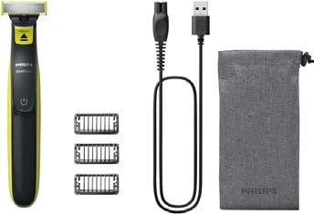 Typ „ONE Blade QP2724/14“. Für jede Haarlänge geeignet. Zweifach-Schutzsystem für die Haut. 3 aufsteckbare Trimmeraufsätze (1, 3, 5 mm) und 2 Klingen. Nass und trocken anwendbar. 45-min-NiMH-Akku. Je Stück
