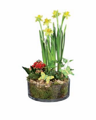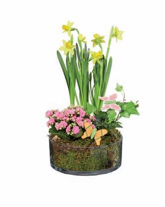 Bepflanzte Glasschale Mit Narzissen, Kalanchoe und Hedera. Inkl. 2 Schmetterlingsstecker. Höhe (inkl. Topf): ca. 10–14 cm. Ø = 18 cm. Je Schale