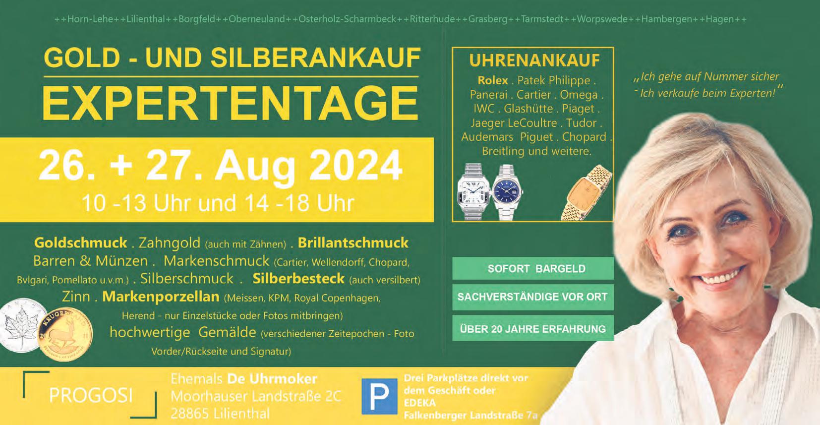 ständiger die Wertgegenstände und der Kunde kann sofort Bargeld in Empfang nehmen. Neben Altgold werden auch Brillantschmuck, Antikschmuck und Zahngold (auch mit Zähnen) angekauft. Hochwertige Uhren werden vor Ort geprüft und dem Kunden ein Angebot unterbreitet. So konnten die Expertentage schon viele Kunden begeistern - auch aus dem Bremer Umland, die aufgrund von Empfehlungen und der hohen Ankaufspreise das Fachgeschäft besuchen. Vorsicht! Polizei und Medien warnen vor fliegenden Händlern, die nur für einige Tage oder Wochen leerstehende Ladengeschäfte anmieten und den Ankauf von Gold, Uhren und Pelzen zu überhöhten Preisen bewerben. Häufig handelt es sich um Lockangebote, die zu einem finanziellen Schaden der Kunden führen könnten. Hausbesuche solcher fliegenden Händler dienen häufig zu Vorbereitungen für andere Straftaten, wie z.B. Diebstähle oder Einbrüche.