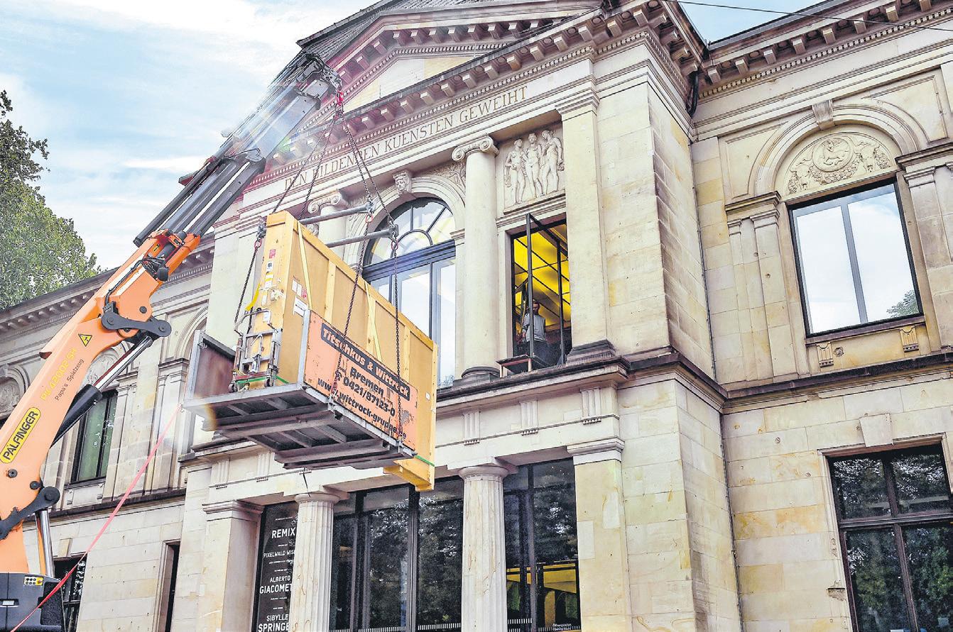 Wer kürzlich an der Kunsthalle vorbeiging, staunte nicht schlecht. Der Bereich rund um die Galerie war großräumig abgesperrt. Davor standen ein Kranführer mit Helm, mehrere Personen, die Seile zum Abspannen in den Händen hielten, begleitet von Mitarbeiterinnen und Mitarbeitern der Kunsthalle mit leicht angespannten Gesichtern. Im Mittelpunkt: ein gewaltiges, gut verpacktes Kunstwerk, rund 2,5 mal 4 Meter groß, das durch kein Treppenhaus passte. In die Galerie gelangte der Neuankömmling auf dem einzig möglichen Weg –durch das Fenster im ersten Stock.