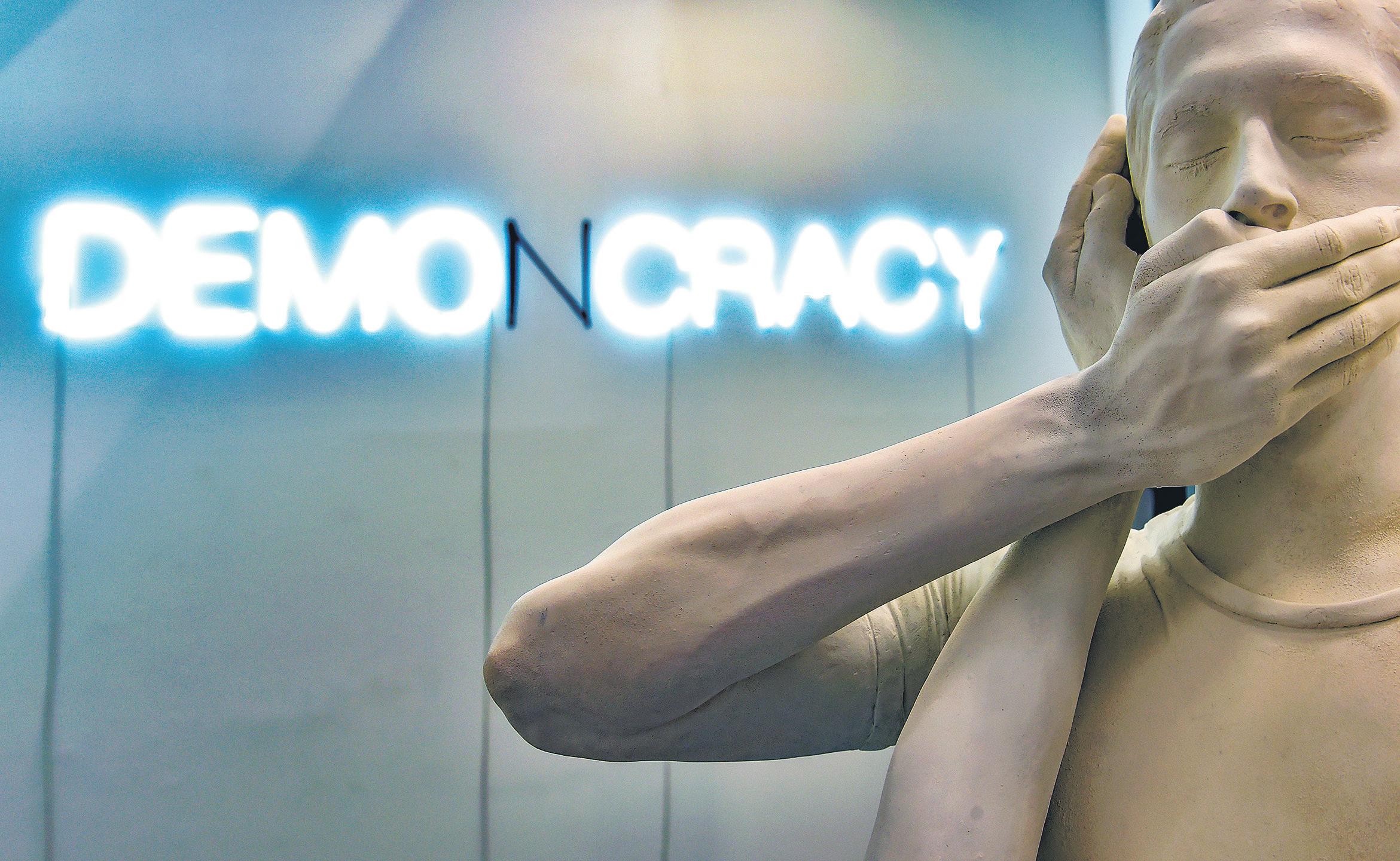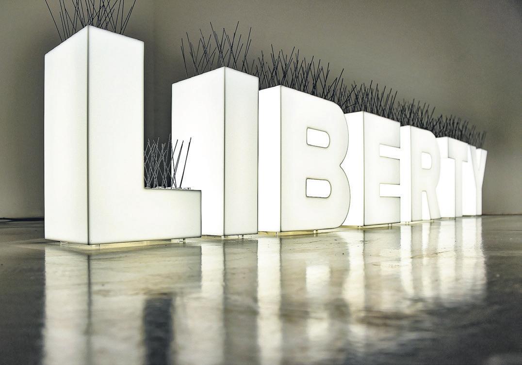 findet das Thema in Werken wie der raumgreifenden VideoInstallation Mandy’s Piano Solo in Columbine (Bunny Rogers), die den Museumsraum in eine Indoor-Winterlandschaft verwandelt und auf den Amoklauf in einer High School verweist. Oder die Neonbuchstaben (von Kader Attia), die das Wort „Democracy“ bilden und die mit nur einem gepinselten „n“ plötzlich dämonisch verfremdet werden. Oder der leuchtende Schriftzug Liberty (Sejla Kameric), der zwar stabil wirkt und leuchtet, aber mit Stacheln bewehrt ist und damit sogar sein eigenes Friedenssymbol, die Taube, abwehren würde.