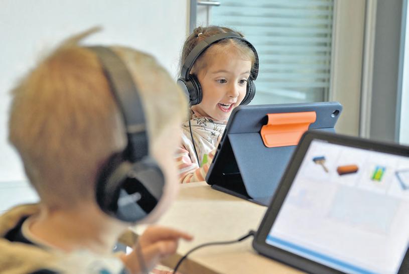 hörer bekommen die Kinder ein Wort gesagt, zum Beispiel: Pfeil. Dann sind auf dem Bildschirm vier Bilder zu sehen, und die Kinder klicken im besten Fall das richtige an“, erklärt Block. „Hä, hier ist doch gar kein Pfeil, oder?“, wundert sich Vitali. Der Haken: Gemeint ist kein Pfeil wie auf einem Verkehrsschild, sondern einer, der mit einem Bogen abgeschossen wird. Nach kurzem Überlegen klickt Vitali schließlich doch das richtige Bild an. Im zweiten Testabschnitt werden „abstrakte Begriffe“ abgefragt. „Es wird schon ein bisschen schwerer“, meint Block. „Wenn den Kindern zum Beispiel das Wort ‚größer‘ gesagt wird, müssen sie das größere Symbol anklicken.“ Vitali und Fenja, die den Test in der Kita gemeinsam absolvieren, meistern die Aufgaben ohne Schwie-