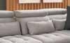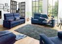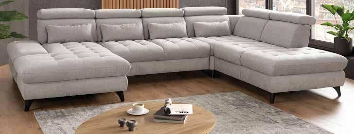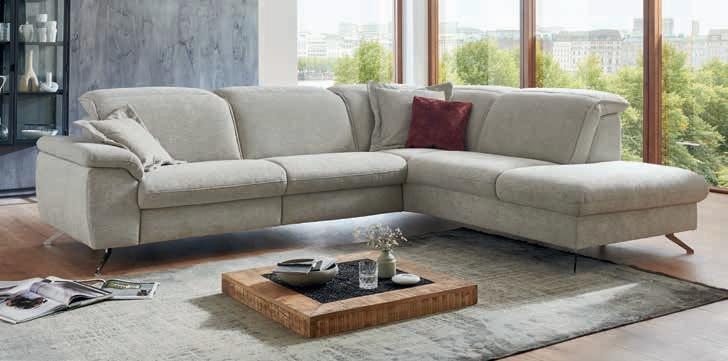 Polstergarnitur im Bezug Holiday steel mit Metallfüßen und Kontrastnaht, best. aus: 3-Sitzer links, Spitzecke und 1,5-Sitzer mit Anstellhocker rechts, Sitzhöhe: ca. 49 cm, Sitztiefe: ca. 59-79 cm, Stellmaß: ca. 302x259 cm. Umplanbar / Inklusive Rücken echt / Boxspringfederung. Online-Shop: 08580023 / Auf Wunsch mit Nierenkissen