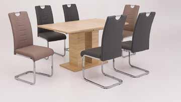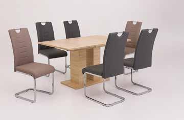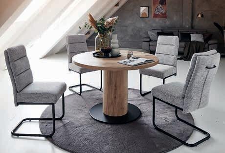 Schwingstuhl im Webstoff Fantasy platingrau, Gestell in Rundrohr Eisen schwarz, Micro-Taschenfederkern im Sitz und Griff im Rücken. On- line-Shop: 01950124 / statt je 327,-* jetzt je 139,- / Esstisch in Dekor Halifax natur, Boden- platte in schwarz, ø ca. 115(160) cm. Inklusive Einlegeplatte. Online-Shop: 01950008 / statt 1.659,-* jetzt 699,-