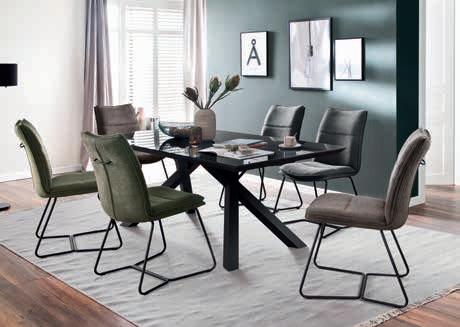 Bezug in Florida silver und Gestell in Eisen schwarz, mit Griff im Rücken und Wellenfederung im Online-Shop: 0195006013 / statt je 416,-* jetzt je 179,- / 2 Esstisch, Tischplatte und Gestell in Artisan Eiche Dekor mit Applikation in Edelstahl-Optik, inklusive Einhand-Klappeinlage, ca. 160(230)x76x90 cm. Online-Shop: 01950105 / statt 1.596,-* jetzt 669,- / 3 Schwingstuhl, Bezug in Florida aqua und Gestell in Edelstahl gebürstet, mit Griff im Rücken und Wellenfederung im Sitz. Online-Shop: 0195006001 / statt je 313,-* jetzt je 129,-