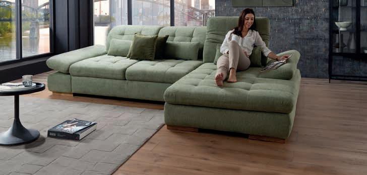 grünem Bezug, mit wildeichefarbigen Holzfüßen, best. aus: 2-Sitzer mit Armlehne links und Longchair mit Armlehne rechts, Sitzhöhe: ca. 43 cm, Sitztiefe: ca. 57-83 cm, Stellmaß: ca. 306x199 cm. Umplanbar / Inklusive Rücken echt. Online-Shop: 0418004916 / Auf Wunsch mit Kopf- und Armteilverstellung.