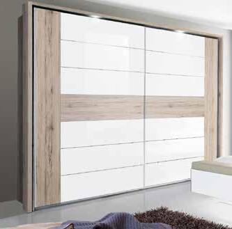 Schlafzimmer in Eiche Bianco Nachbildung mit Absetzungen in Champagner, best. aus: Funktionsschrank, 6-trg., 2 Schubladen, ca. 300x216x58 cm, Doppelbett mit Polsterkopfteil in Kunstleder Champagner, LF: 180x200 cm und 2 Nachtkonsolen / statt 643,-* jetzt 319,- / Ohne Rahmen, Auflagen und Beimöbel. Online-Shop: 03260029 / Auf Wunsch mit Bettkasten, Passepartoutrahmen, Nachtkonsolen-Paneel und Beleuchtung.