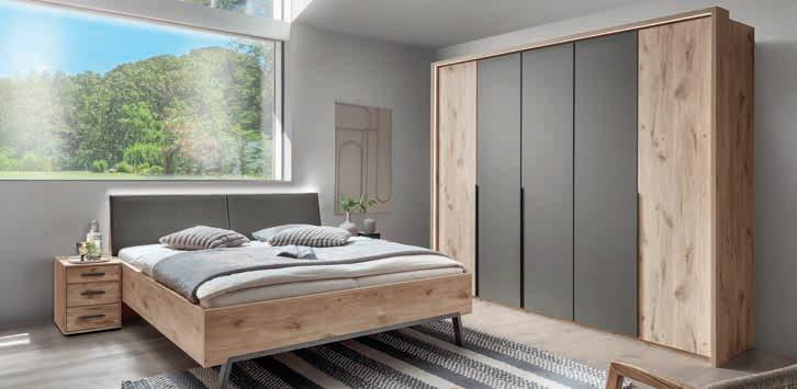 Schlafzimmer in Nordic Eiche NB, Absetzung in Havanna, best. aus: Drehtürenschrank, 5-trg., ca. 250x216x58 cm, Doppelbett mit Polsterkopfteil mit Kunstleder Havanna, LF: 180x200 cm und Hängenachtkonsolen-Paar mit 1 Schublade. ca. 60x48x43 cm. / statt 561,-* jetzt 249,- / Ohne Rahmen und Auflagen. / Auf Wunsch mit Passepartoutrahmen, Nachtkonsolen-Paneel und Beleuchtung. Online-Shop: 0326007898