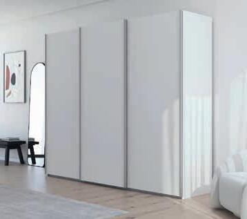 Komfortzimmer in Bianco Eiche Nachbildung. Bestehend aus: Drehtürenschrank, 3-trg., mittig mit Spiegel, Komfortbett, LF: 100x200 cm und einer Nachtkonsole. Ohne Rahmen und Auflagen. Online-Shop: 03260068 / Auf Wunsch mit Kranzleiste, Bettschubkasten und Nachtkonsolen-Paneel mit Beleuchtung.