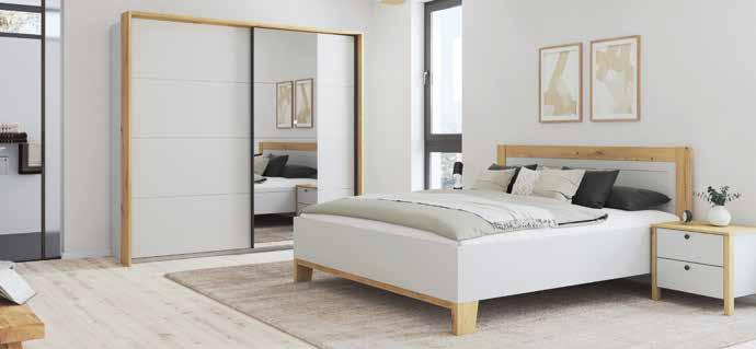 Schlafzimmerprogramm Weiß/Absetzung Viking Oak hell. best. aus: Schwebetürenschrank 2-türig mit Spiegel, ca. 271x226x60 cm. Onlineshop 07120095 1.491,-* 699,Bettanlage Kopfteil in Cordoptik beige, 2 Nachtkonolsen mit je 1 Schubkasten, Paneel inkl. Beleuchtung, LF: ca. 180x200 cm, ca. 298x99x223 cm. Onlineshop 0712009501