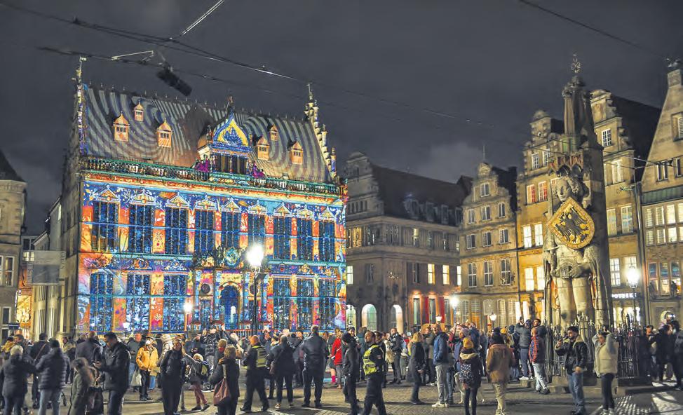 Unter dem Motto „Vier Jahreszeiten“ verwandeln Künstlerinnen und Künstler vom 3. bis 19. Januar wieder prägende Bremer Fassaden in Lichtkunstwerke. Jeweils von 16.30 bis 22 Uhr werden etwa Schütting, Baumwollbörse und Dom zu Leinwänden. Neu dabei sind bei der fünften Auflage der Veranstaltung erstmals das Wallkontor und das Made-in-Bremen-Haus am Domshof. Eine Neuheit stellt die 3D-Show am Schoppensteel dar, die mit interaktiver Hologramm-Technik arbeitet. Aktuelle Informationen und Details zu den „Lichtern der City“ gibt es auf bremen-city.de Archivfoto: Schlie