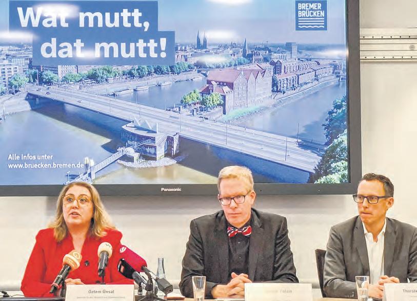 len dort auch zunächst Fachkräfte angeworben werden. Um aber den öffentlichen Nahverkehr möglichst bald wieder über die Smidt-Brücke fahren zu lassen, werden drei zentrale Maßnahmen eingeleitet, so Polzin: „Technische Nachrechnung für Busverkehr: Die Hochschule Bremen prüft, ob Busse unter bestimmten Bedingungen sicher über die Brücke fahren können.“ Erste Ergebnisse würden in den kommenden Wochen erwartet. Als nächstes denkt Polzin an einen Belastungstest für Straßenbahnen: „Ein MonitoringSystem wird detaillierte Daten zur Tragfähigkeit liefern. Erste Erkenntnisse werden in diesem