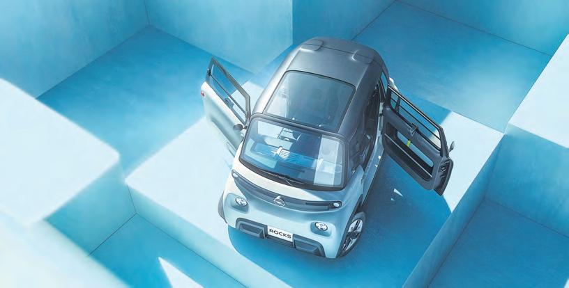 dekabel ist in die Seitenwand hinter der Beifahrertür integriert und wird dort bei Bedarf einfach herausgezogen. Mit einem Wendekreis von nur 7,20 Meter können Fahrer den 2,41 Meter kurzen und gerade einmal 1,39 Meter breiten Rocks durch enge Kurven oder in kleine Parklücken lenken. Dabei wird der City-Stromer mit seinem frischen Styling einmal mehr zum unkonventionellen Hingucker –auch weil die beiden Türen Rockstypisch identisch gestaltet sind. Die Beifahrertür schwingt nach vorne, die Fahrertür gegenläufig nach hinten auf. Im Innenraum ist der Rocks ebenfalls voll auf die Bedürfnisse der jungen Generation ausgerichtet. Die konsequent auf Funktio-