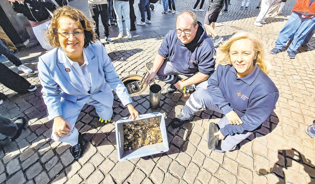 Tausende Euro werfen Touristen und Einheimische jährlich in das „Bremer Loch“ der WilhelmKaisen-Bürgerhilfe. Zum Dank hören sie ein Krähen oder Maunzen der Stadtmusikanten. Britta Kujamska (r.) und Dennis Dufeu (DRK) holten die Münzen in dieser Woche heraus. Bürgerschaftspräsidentin Antje Grotheer (l.) entdeckte auch „einen Deckel mit Werder Raute“. Noch besser: Es waren auch 31.890,66 Euro für die Arbeiterwohlfahrt (AWO) drin.