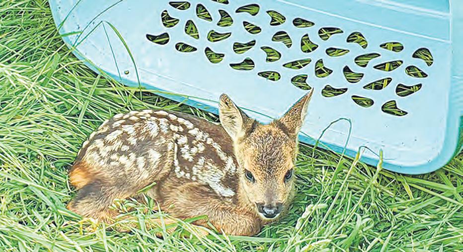 ter“, obwohl der Helfer am Boden noch gar kein Kitz entdeckt hat. Umso schöner das Gefühl, wenn dann tatsächlich ein Kitz unter dem Wäschekorb ist, der dann mit Heringen gesichert wird. Schnell noch eine Fahne in den Boden und dem Bauern die Fundstelle melden, damit er weiß, welchen Bereich er bei der Mahd aussparen muss.