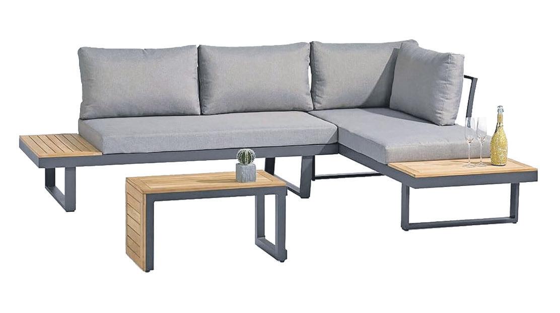 Aluminium-Gestell anthrazit mit Elementen aus massivem Akazienholz, inkl. Sitz und Rückenkissen in hellgrau, besonders vielseitig Zusammenstellbar, inkl. Beistelltisch 70 x 41 x 35 cm, Maße der Bänke 175 x 84 x 75 cm
