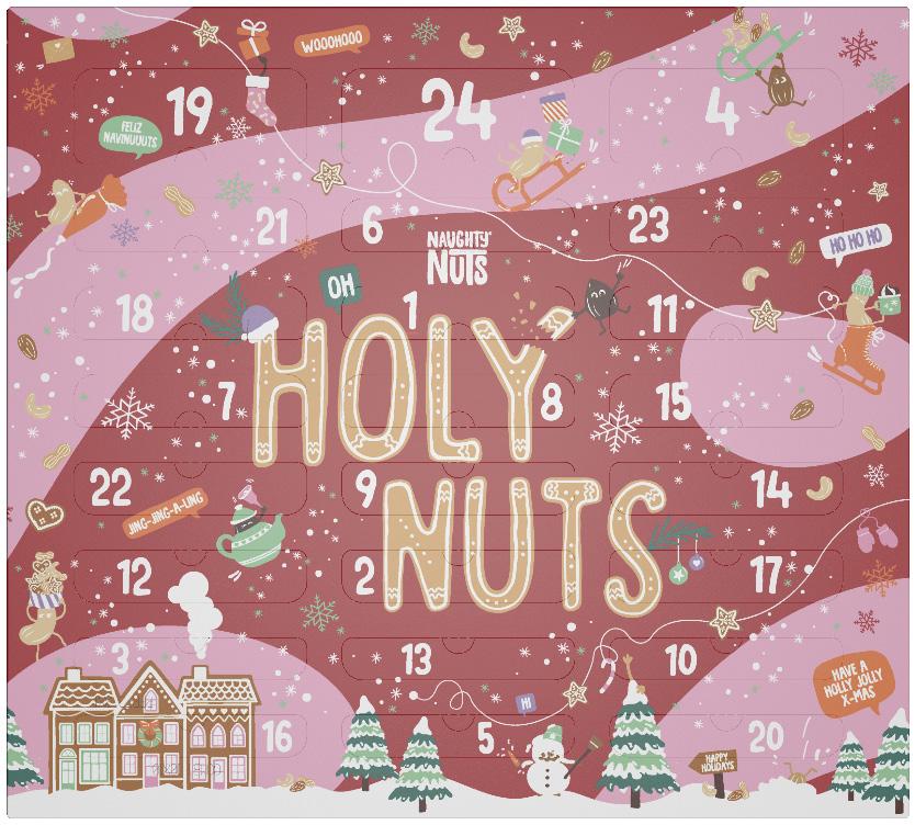 Bio veganer Adventskalender Enthält cremiges Nussmus, energiereiche Riegel und unwiderstehliche Nutbutter Cups – alles 100% vegan und biologisch. 712 g 1 kg = 56.17