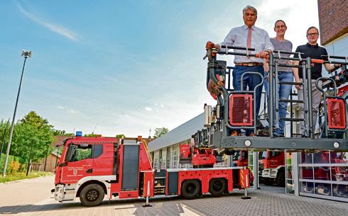 Bürgermeister Lutz Brockmann sowie Wiebke Held-Witte und Philipp Rohlfing vom Ordnungsfachbereich beim Drehleiter-Check.