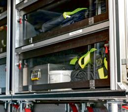 Rollcontainer mit Wechselkleidung im Gerätewagen Hygiene: Säubern und umziehen können sich die Feuerwehrleute jetzt direkt am Einsatzort.