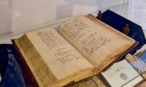 Leihgabe aus dem Stadtarchiv für eine Domherrenhaus-Ausstellung 2022: das Civitatis Verdensis Statuta von 1582, ein in Leder gebundenes Werk für die einstige städtische Rechtsprechung. Stadtarchiv Verden
