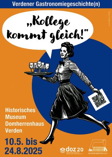 Die Ausstellung „Kollege kommt gleich!“ Verdener Gastronomiegschichte(n)“ im Domherrenhaus läuft noch bis einschließlich Sonntag, 24. August. Eine Führung durch die Schau wird noch einmal am Sonntag, 3. August, um 11 Uhr angeboten. Individuelle Führungen sind aber ebenfalls buchbar. Alle Infos unter domherrenhaus.de Grafik: Hist. Museum Domherrenhaus