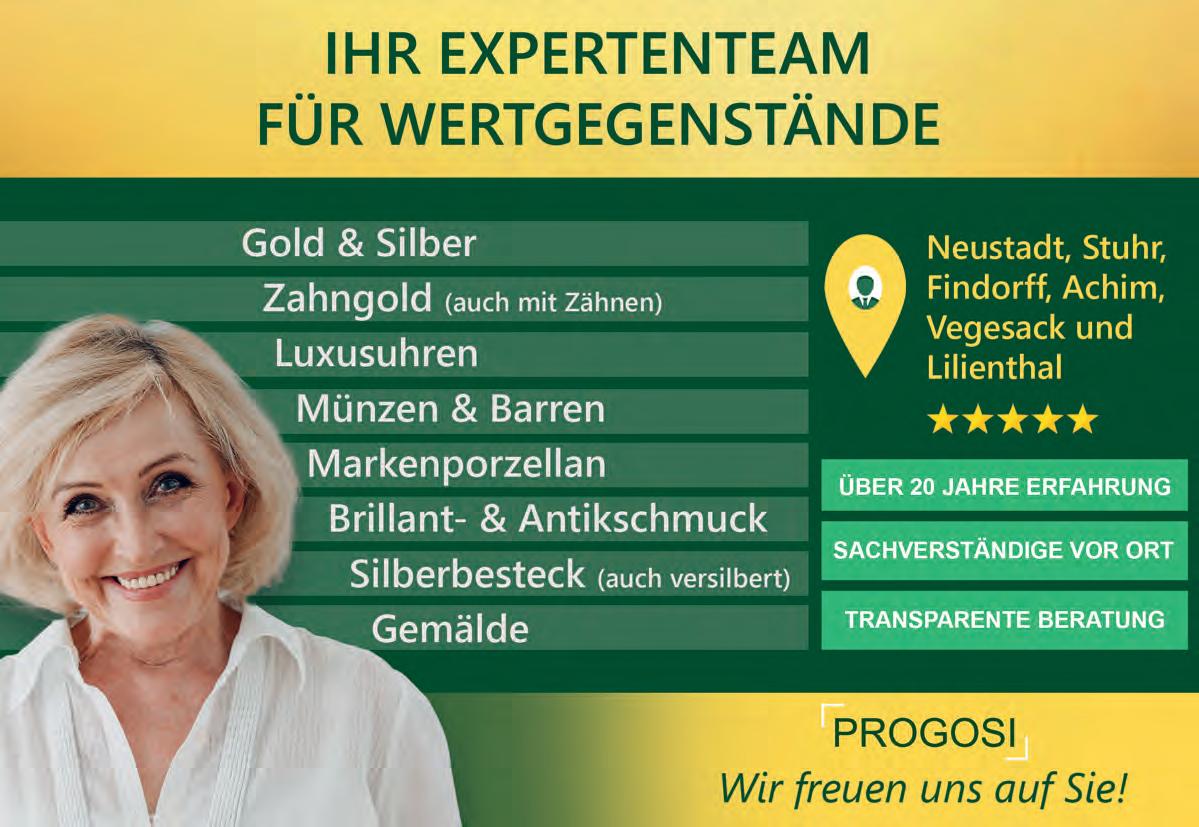 Die Expertentage finden in den sechs Filialen in Achim, Stuhr, Lilienthal, Vegesack sowie bei Uhren Jakel (Neustadt und Findorff) statt. Für Hausbesuche kann die Firma unter: 0163 / 3665 592 von 8 bis 13 Uhr oder unter www.progosi.de kontaktiert werden. fr