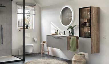 Mehr Großzügigkeit für jedes Bad erreichen Sie durch großformatige Fronten und Türen sowie ein durchgängiges Farbkonzept, z. B. in softem Taupegrau. Integrierte Glaselemente und der schwebende Unterschrank vergrößern optisch und lockern auf. Nutzen Sie die Möglichkeiten neuer Details wie die schwarzen Griffe, Armaturen und Handtuchhalter.