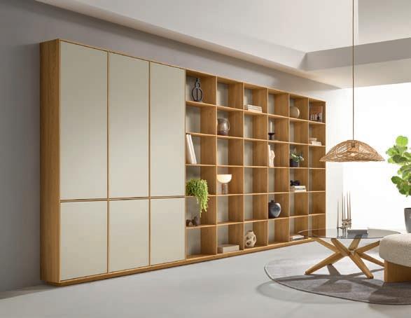 04 Wohnwand CONTUR Venzone, Lack hellgrau, Abdeckplatte in Melamin Eiche Optik, optional in Eiche Furnier, bestehend aus: Lowboard bodenstehend mit Gleitern, 3 Schubladen und Hängevitrine mit 2 Türen, 3 offene Fächer, Grifflos Push-zo-Open, BHT ca. 360x185x52 cm ab 3999.-
