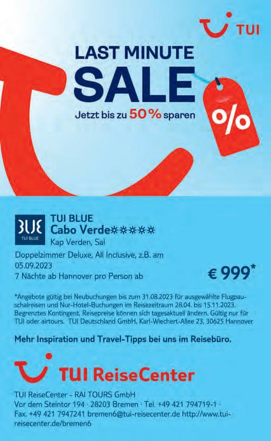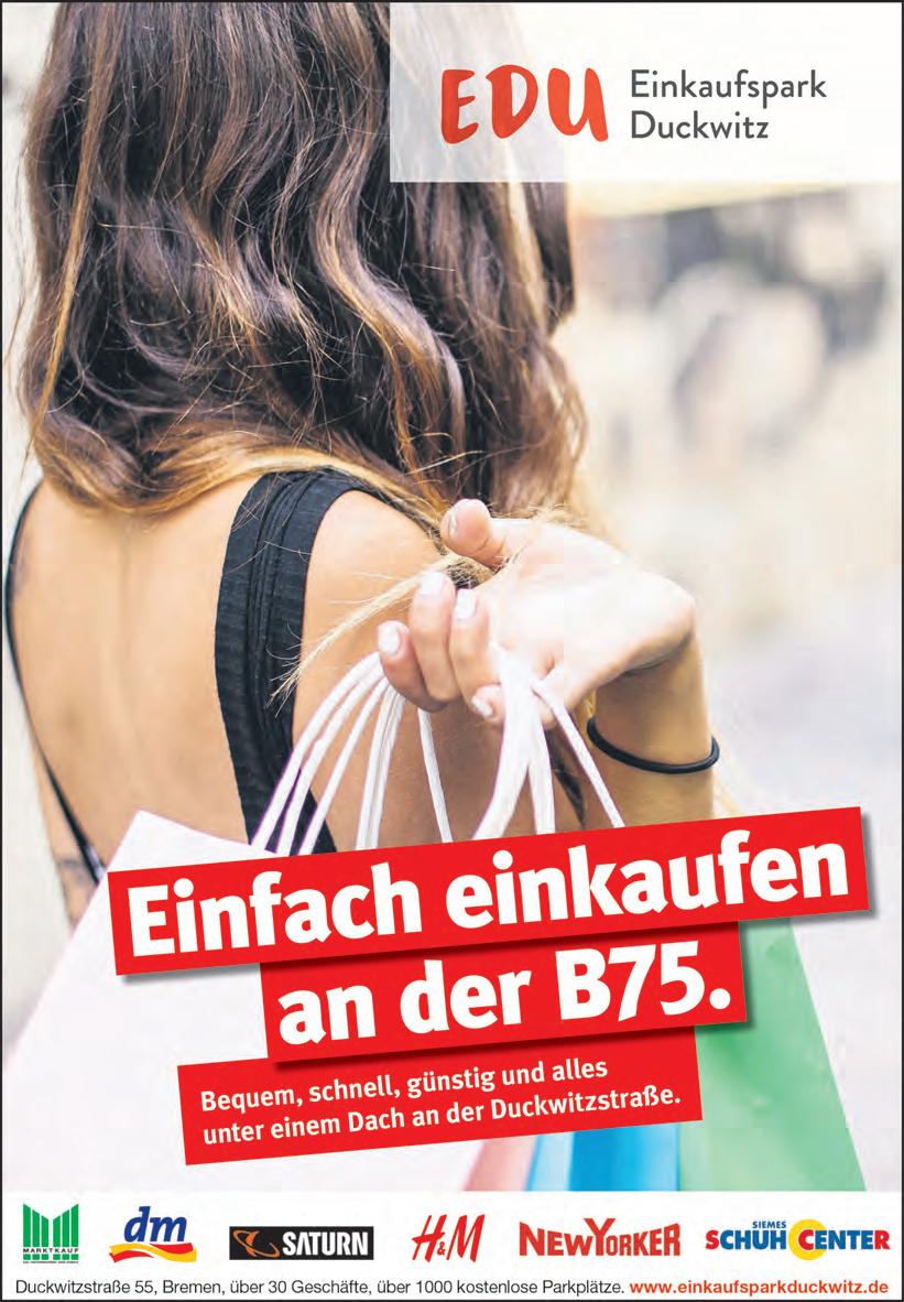 Auf AufderSuche nach nacheinem Jobbmit Zukunft? der Suche einem mit kunft? www.kliniken-lkd.de/kennenlernen Kultur: Bettina Meister Das BLV: Regina Drieling, Antje Spitzner Büro Osterholz-Scharmbeck : Jasmin Johannsen, Marius Roskamp Fotos: Klaus Werner Schlie Anzeigenleiter: Johannes Knees Kleinanzeigen: Tel. 36 66 400, Fax 36 66 500 Gestaltete Anzeigen: Tel. 36 66 101 info@weserreport.de Zurzeit gelten Anzeigenpreisliste Nr. 50 vom 29. Januar 2023 und unsere darin abgedruckten AGB. Falls Sie dieses Produkt nicht mehr erhalten möchten, bitten wir Sie, einen Werbeverbotsaufkleber mit dem Zusatzhinweis „Keine kostenlosen Zeitungen“ an Ihrem Briefkasten anzubringen. Weitere Informationen