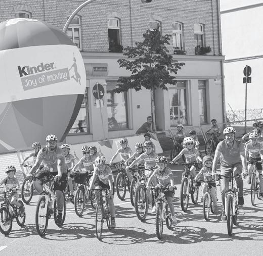 DieDeutschland Tour, daswichtigste deutscheEtappenrennen im Straßenradsport,feiert am 27. August ihr großes Finalein Bremen Mitdabeiistauchdie„kinder Joy ofMovingminitour“:Die Zwei- bisFünfjährigendürfensich beim Laufradrennenaufdenletzten 100 m derProfistreckebeweisen. BeiderBikeParadekönnen sich alleKidszwischensechsund zwölf JahreninihrenkinderJoyof Moving-TrikotswiedieProfis fühlen. MitRadsport-LegendeJens Voigtfahrensieaufdergleichen Strecke wiewenigspäterihreIdole. Die Teilnehmerzahlistbegrenzt. Außerdem habenkleineundgroße KidsdieMöglichkeit,ineiner