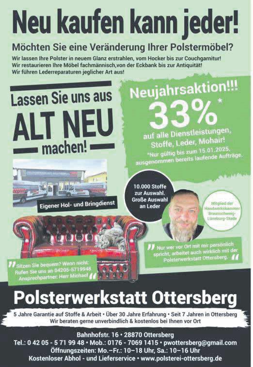 Mit alten Möbeln ins neue Jahr: Besonders schöne Stücke sind oft mit Erinnerungen und Emotionen verknüpft und begleiten uns nicht selten ein Leben lang. Im Lauf der Zeit können sie jedoch ihren Glanz verlieren oder beschädigt werden. Wer kennt nicht das Problem, dass die Wohnzimmersessel nicht mehr zur neuen Wandfarbe passen oder das von der Großmutter geerbte Sofa durchgesessen ist und einen neuen Bezug benötigt? Auch Flecken auf dem Esszimmerstuhl oder altersschwache Kommoden können das Wohnambiente stören. Für all diese Fälle gibt es eine Lösung: die Polsterwerkstatt Ottersberg. Seit sieben Jahren bietet sie ihren Kunden hochwertiges Handwerk und eine umfassende Beratung. Ob es darum geht, alte Möbel aufzuarbeiten, zu polstern oder komplett zu verändern – hier sind Profis am Werk. Der Profi Rocky Michael, gelernter Polsterer mit mehr als 30 Jahren Erfahrung, führt das Unternehmen mit dem Fokus auf Nachhaltigkeit und Kundenzufriedenheit. In der Werkstatt stehen den Kunden rund 10.000 verschiedene Stoffe, darunter verschiedene Leder, zur Verfügung. Auch für Wohnmobile und -wagen gibt es ein Sortiment an Outdoorstoffen. Doch was den Betrieb besonders auszeichnet, ist die individuelle Beratung vor Ort.