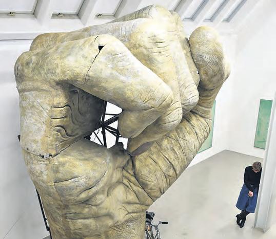 Mit pointiert eingesetzten Mitteln beschwören sie Geschichten von eindrücklicher Intensität. Dabei pendeln ihre Werke zwischen humorvoller Leichtigkeit und poetischer Tiefe und sind auch immer eine kritische Bestandsaufnahme dessen, was Kunst sein kann. Absolut gigantisch ist beispielsweise eine fünf Meter hohe Faust, die unter dem Titel „Hercules“ als weithin sichtbares Zeichen des Widerstandes den Raum beherrscht. bm