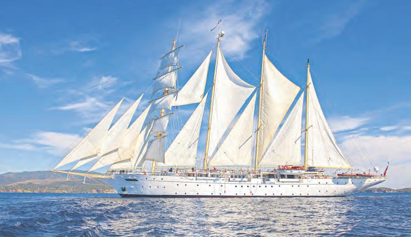 gerichtet. Vom Hafen aus lassen sich die angelaufenen Orte leicht zu Fuß erreichen und so bequem erkunden. Ein absolutes Muss ist ein Bummel durch das malerische Portofino. Man kann sich aber auch auf der Suche nach dem Gendarmen von St. Tropez machen oder auch nur sein Badezeug einpacken, den nächsten Strand ansteuern und sich in den blauen Fluten der Côte d’Azur erfrischen. Zwischen unterhaltend und nervenkitzelnd bewegt sich das angebotene Bordprogramm. Dass die Talente der stets herzlichen Crewmitglieder sich n icht nur auf Cocktails mixen, exzellent kochen oder servieren beschränken, zeigen die Frauen und Männer der „Star Flyer“ in der Crew-Show. Mit Tanz- und Gesangseinlagen unter weißen Segeln und leuchtendem Sternenhimmel begeistern sie ihr Publikum. Aber auch die Kreuzfahrenden selbst können beim Mastklettern an Bord zu Protagonisten werden – vorausgesetzt sie haben keine Höhenangst. Gut gesichert geht es auf einer Strickleiter hoch zu einem Ausguck in – geschätzt – etwa 20 Meter Höhe. Der Mut wird belohnt mit einem Rundumblick auf die „Star Flyer“ und f reie Sicht auf das blaue Meer und die Küste. So viel Mut konnte die bereits erwähnte Stuttgarterin nicht aufbringen. Dieser reichte allerdings dafür aus, dass sie ins g roße Netz am Bug des Schiffes kletterte und für kurze Zeit ihren ganz besonderen „Star Flyer“-Moment genießen durfte – trotz großem Nervenkitzel, aber auch so werden Segelträume wahr.