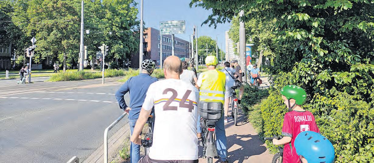 Handgestoppte 205 Sekunden kann es dauern, bis man die DoventorKreuzung überquert – wenn alles ungünstig zusammenkommt. Während die Straßenbahnen über die Schienen rumpeln und Autos vorbeiziehen, bleiben also etwas unter dreieinhalb Minuten Zeit. Genug, um gründlich Zähne zu putzen, den Weltrekord im 1.500 Meter Lauf der Männer zu brechen oder fast einmal „Lebenslang Grün-Weiß“ zu singen. Kurz: Man wartet lange. Zu lange, findet Frauke Maack, Sprecherin des Bremer Allgemeinen Deutschen Fahrrad-Clubs (ADFC): „Grund dafür ist wahrscheinlich die Abstimmung der verkehrsabhängigen Ampelschaltung auf den Autoverkehr und die ÖPNV-Bevorrechtigung an Ampeln.“ Zudem seien die beengten Platzverhältnisse auf dem