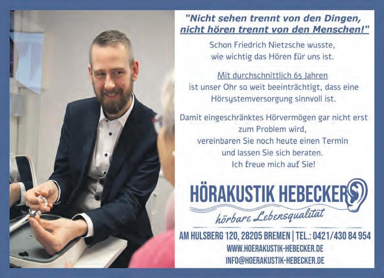 9–13 Uhr und 14–18 Uhr und Mi. 9–13 Uhr, Am Hulsberg 120, 28205 Bremen, Tel.: 0421/430 84 954 www.hoerakustik-hebecker.de, info@hoerakustik-hebecker.de