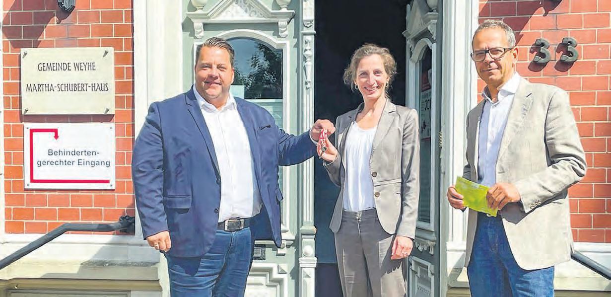 Weyhes Bürgermeister Frank Seidel übergibt den Schlüssel für das Martha-Schubert-Haus an Laura Windirsch und Axel Theis von der Krebsberatungsstelle Igel. Die Beratungen werden in Weyhe immer montags und freitags angeboten. Foto: Runge