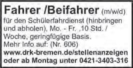 für den Weser Report und Delme Report und für den Hamme / Wümme Report 0421-36 66 400 oder per E-Mail an fliesstext@weserreport.de Mahndorf, suche Haushaltshilfe, flexibel, mit dem Blick fürs Wesentliche. Dt. Sprachkenntnisse sind Bedingung. 0175 90 44 592