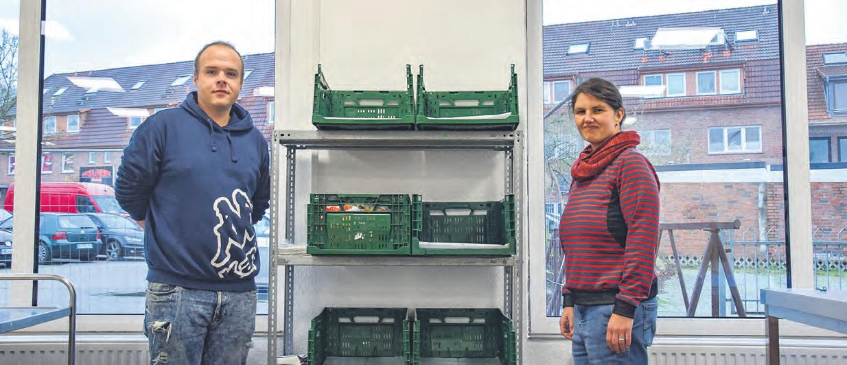 Aus Kisten wie diesen geben die Freiwilligen der Tafel Obst und Gemüse an die Kundschaft der Tafel aus. Alex und Lotta Kohlmann freuen sich über die neuen, größeren Räume an der Kirchenstraße 13.
